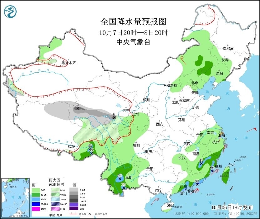 10月7日20時至8日20時,新疆西南部、青海中南部、西藏北部等地的部分地區(qū)有小到中雪或雨夾雪,青海中部局地有大雪(5~9毫米);西藏東南部、云南中部和南部、廣東中東部沿海地區(qū)、福建中北部和東部以及臺灣島等地的部分地區(qū)有中到大雨,其中廣東南部沿海地區(qū)、福建東南部等地局地有暴雨(50~80毫米)。浙江沿海、福建沿海、廣東沿海、臺灣島西部沿海有6~7級風、陣風8級。東海大部海域、臺灣海峽、南海東北部海域有6~8級風、陣風9~10級,其中臺灣海峽、南海東北部的部分海域有9~10級風、陣風11~13級(見圖2)。
