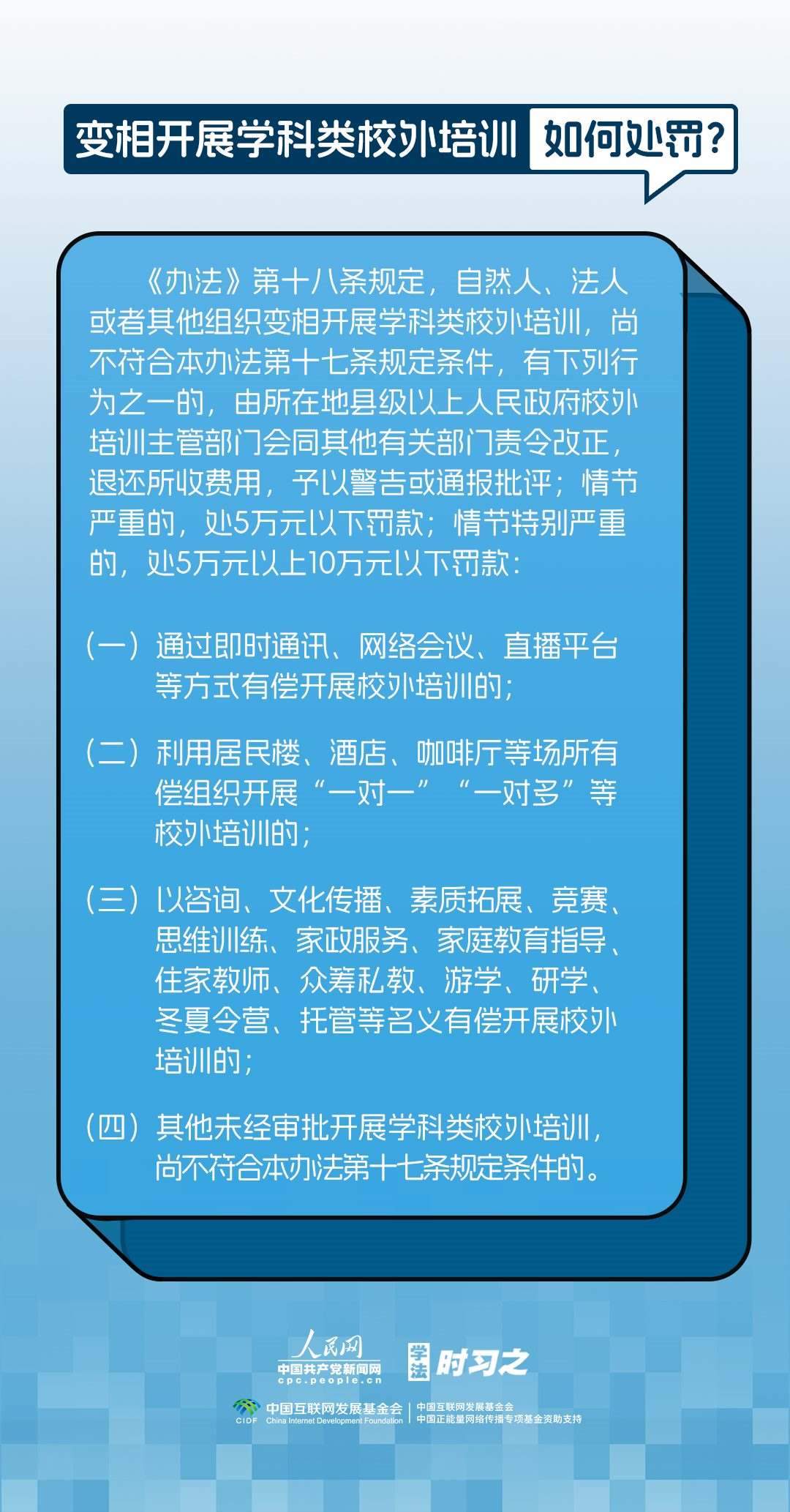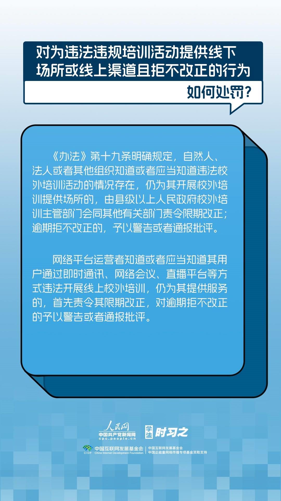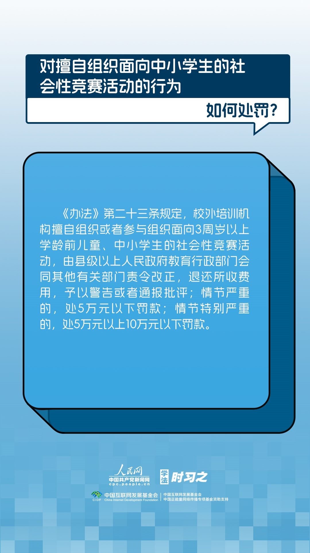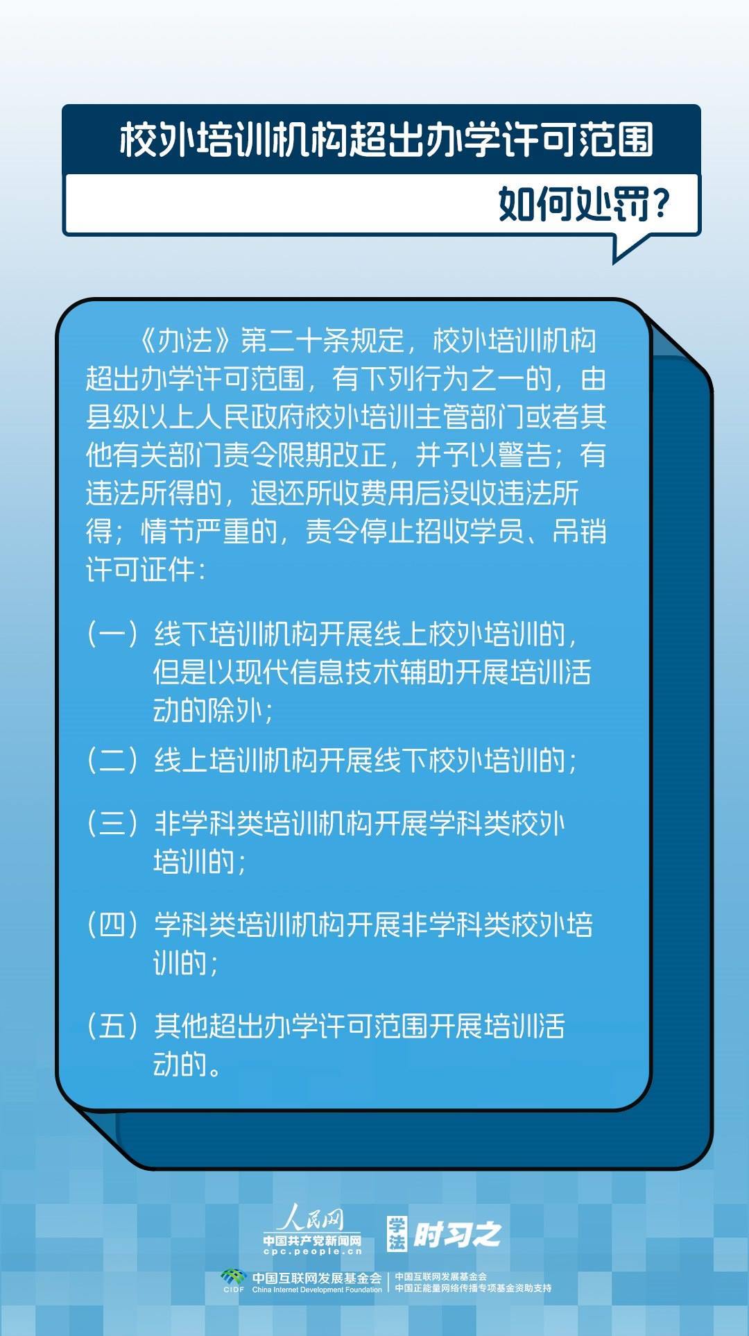 《校外培訓行政處罰暫行辦法》(以下簡稱《辦法》)將于2023年10月15日起施行?!掇k法》提出了校外培訓行政處罰總體要求。規(guī)定適用對象為面向社會招收3周歲以上學齡前兒童、中小學生,違法開展校外培訓的自然人、法人或者其他組織。要求校外培訓行政處罰應當遵循公正、公開的原則,堅持處罰與教育相結(jié)合,引導自然人、法人或者其他組織自覺守法,共同抵制校外培訓違法行為,營造有利于學生成長成才的良好環(huán)境。