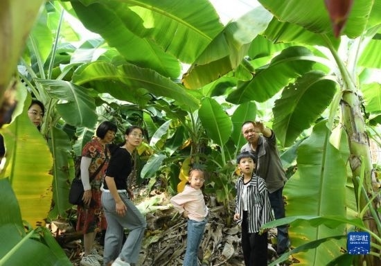 10月18日,在浬浦鎮(zhèn)陶姚村的香蕉大棚內(nèi),兒童在了解香蕉的生長習(xí)性。