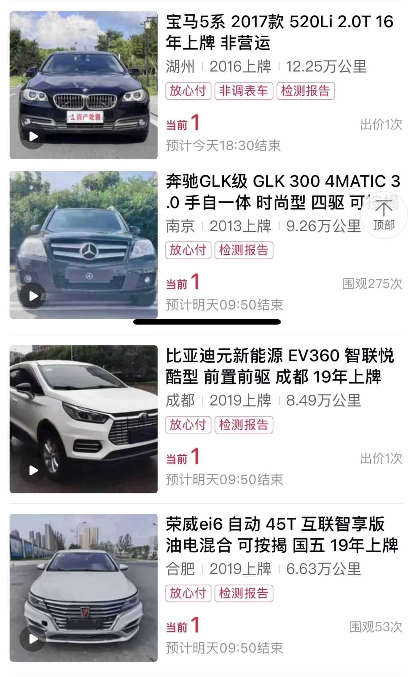“1元賣奔馳”現(xiàn)象在該拍賣公司并只此一例。紅星新聞?dòng)浾咴谏鲜鑫錆h鑫車公司的平臺(tái)拍賣界面上看到,低價(jià)拍賣的車輛并不少見。如該公司掛出的一輛2011年上牌的寶馬2系,起拍價(jià)僅8元;一輛2015年上牌的奔馳GLA起拍價(jià)僅需9元。