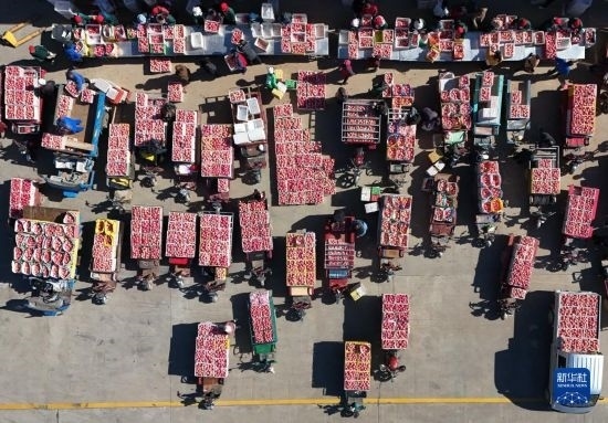 10月20日,果農(nóng)在延安市洛川縣一家果業(yè)企業(yè)售賣蘋果(無(wú)人機(jī)照片)。