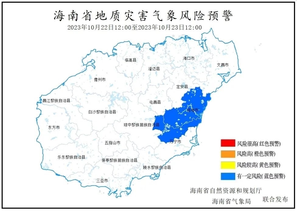 海南省自然資源和規(guī)劃廳、海南省氣象局2023年10月22日10時聯(lián)合發(fā)布地質災害氣象風險預警:根據海南省氣象臺前期降雨實況和未來24小時降雨預報,預計未來24小時(2023年10月22日12:00-10月23日12:00)瓊海市全境,萬寧市龍滾鎮(zhèn)、三更羅鎮(zhèn)、北大鎮(zhèn),瓊中縣中平鎮(zhèn)降雨誘發(fā)地質災害有一定風險,為Ⅳ級風險預警(藍色預警)。請上述市縣、鄉(xiāng)鎮(zhèn)政府及有關部門做好地質災害防御工作。