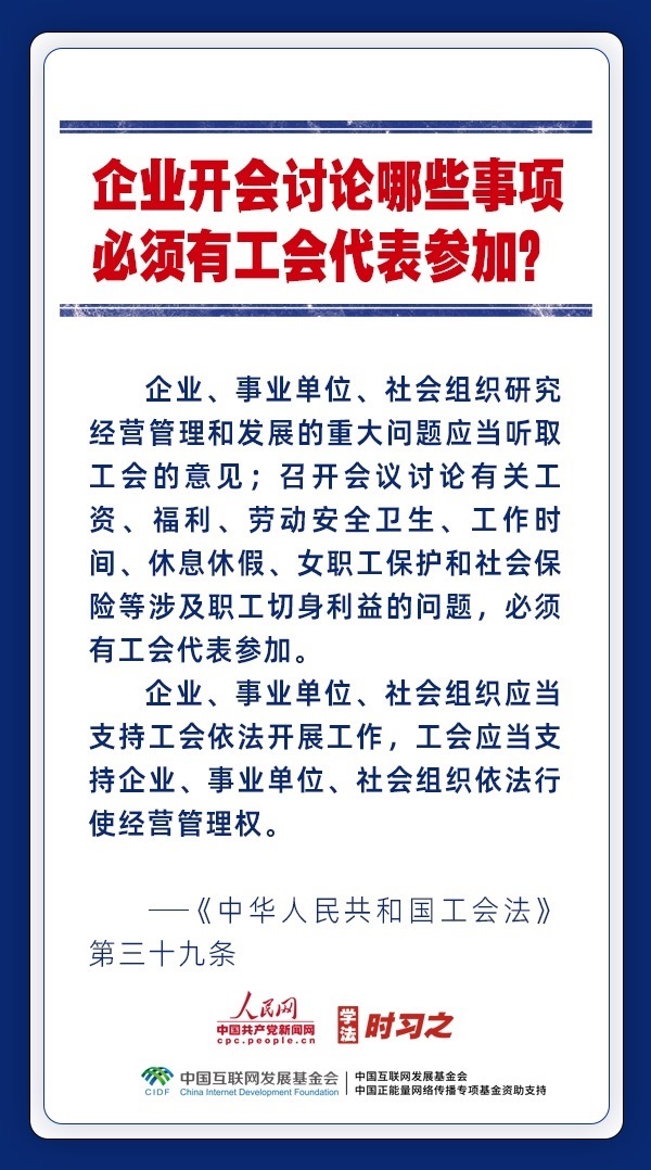 日前,中華全國總工會(huì)新一屆領(lǐng)導(dǎo)班子產(chǎn)生。黨和政府歷來重視工會(huì)的地位作用,十分注重加強(qiáng)工會(huì)法律制度建設(shè),專門為廣大職工制定了《中華人民共和國工會(huì)法》。網(wǎng)約車司機(jī)、快遞員、外賣配送員能入工會(huì)嗎?產(chǎn)業(yè)工人隊(duì)伍建設(shè)改革的目標(biāo)是什么?企業(yè)開會(huì)討論哪些事項(xiàng)必須有工會(huì)代表參加?一起來了解。