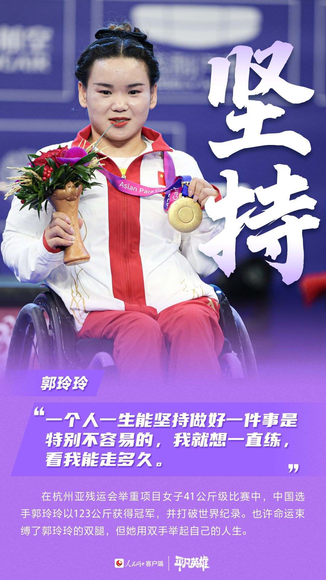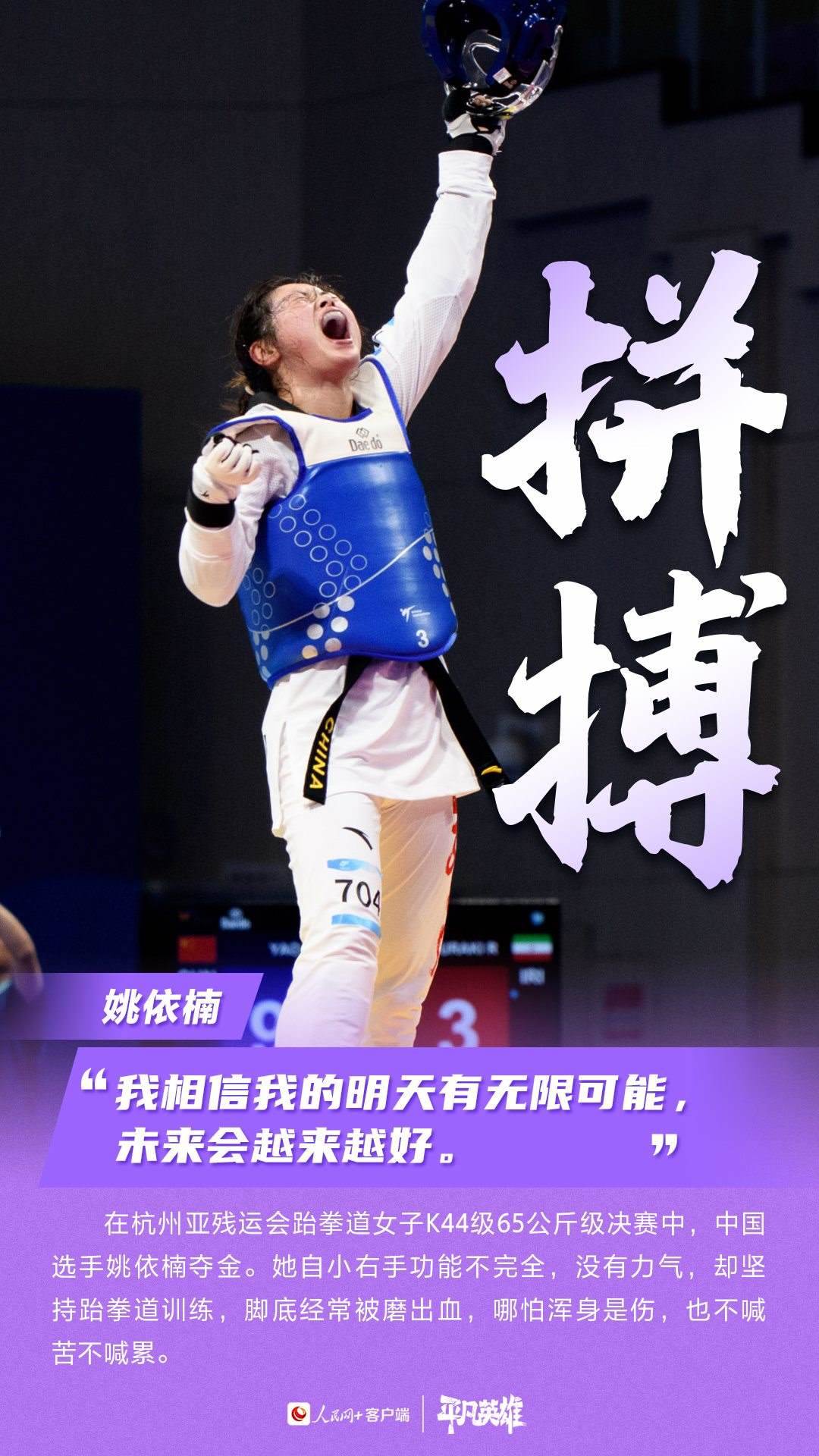 一張張寫滿堅(jiān)韌的臉、一個(gè)個(gè)頑強(qiáng)拼搏的身軀,定格了許多震撼人心的瞬間。在杭州第4屆亞殘運(yùn)會(huì)的賽場(chǎng)上,中國(guó)運(yùn)動(dòng)員用不服輸、不放棄的精神,告訴我們“沒有什么不可能”。致敬每一位運(yùn)動(dòng)員。