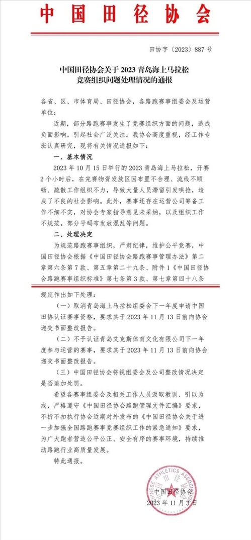 ·中國(guó)田協(xié)通報(bào)大連馬拉松和青島海上馬拉松問(wèn)題處理情況。