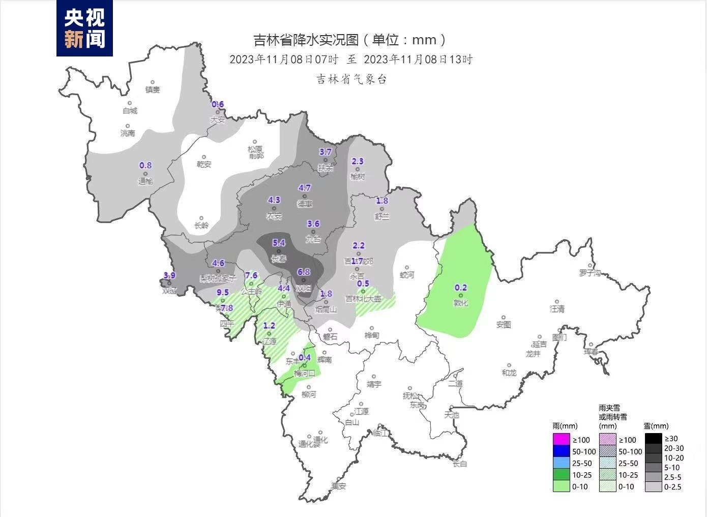 受低空冷切變影響,11月8日早晨開始,吉林省大部出現(xiàn)明顯雨雪天氣,并伴有相態(tài)轉換。當前,吉林省大部分地區(qū)出現(xiàn)了積雪,最大積雪深度出現(xiàn)在榆樹市,積雪深度為30厘米。