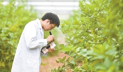 科研人員在潼南檸檬脫毒種苗繁育中心查看樹(shù)苗長(zhǎng)勢(shì)。龍 帆攝