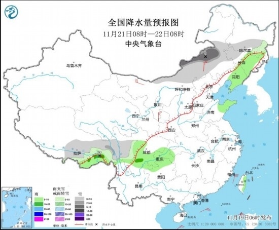 11月21日08時(shí)至22日08時(shí),內(nèi)蒙古中部、黑龍江南部、吉林西部、西藏東南部、川西高原等地部分地區(qū)有小雪或雨夾雪,其中,內(nèi)蒙古中東部、西藏東部等地部分地區(qū)有中到大雪(5~9毫米)。吉林東部、遼寧中東部、山東半島、西藏東南部、四川南部、重慶南部、貴州西北部等地部分地區(qū)有小到中雨,其中,西藏東南部等地部分地區(qū)有大雨(25~30毫米)。內(nèi)蒙古西部和中部、寧夏等地部分地區(qū)有4~6級風(fēng)(見圖4)。