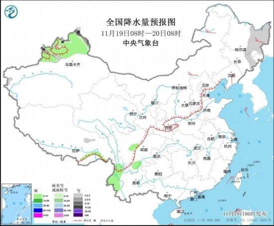 11月19日08時(shí)至20日08時(shí),新疆北部和伊犁河谷、黑龍江東部、吉林東部等地部分地區(qū)有小雪或雨夾雪,其中,新疆北部部分地區(qū)有中到大雪,局地暴雪(10~12毫米)。新疆北部、西藏東南部、四川南部、云南西部等地部分地區(qū)有小雨。內(nèi)蒙古中部和東部、黑龍江東部、遼寧東部等地部分地區(qū)有4~5級風(fēng)(見圖2)。