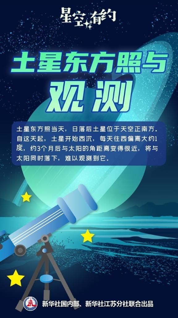 新華社南京11月21日電(記者王玨玢、邱冰清)11月23日17時47分迎來土星東方照,屆時土星將位于天空正南方。土星東方照后的一段時間,土星觀賞條件會逐漸變差,直至完全不可見。到下一次沖日前后,又迎來下一個土星觀賞的最佳時機(jī)。什么是土星東方照?它和土星沖日時看到的土星有什么區(qū)別?天文科普專家為您揭秘。