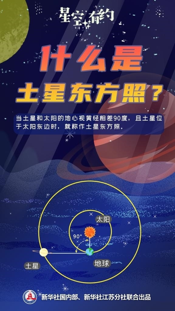 當(dāng)土星和太陽的地心視黃經(jīng)相差90度,且土星位于太陽東邊時,就稱作土星東方照。如果可以俯視太陽系的平面,此時你會看到太陽、地球、土星形成了一個直角,地球處于直角的頂點(diǎn)。