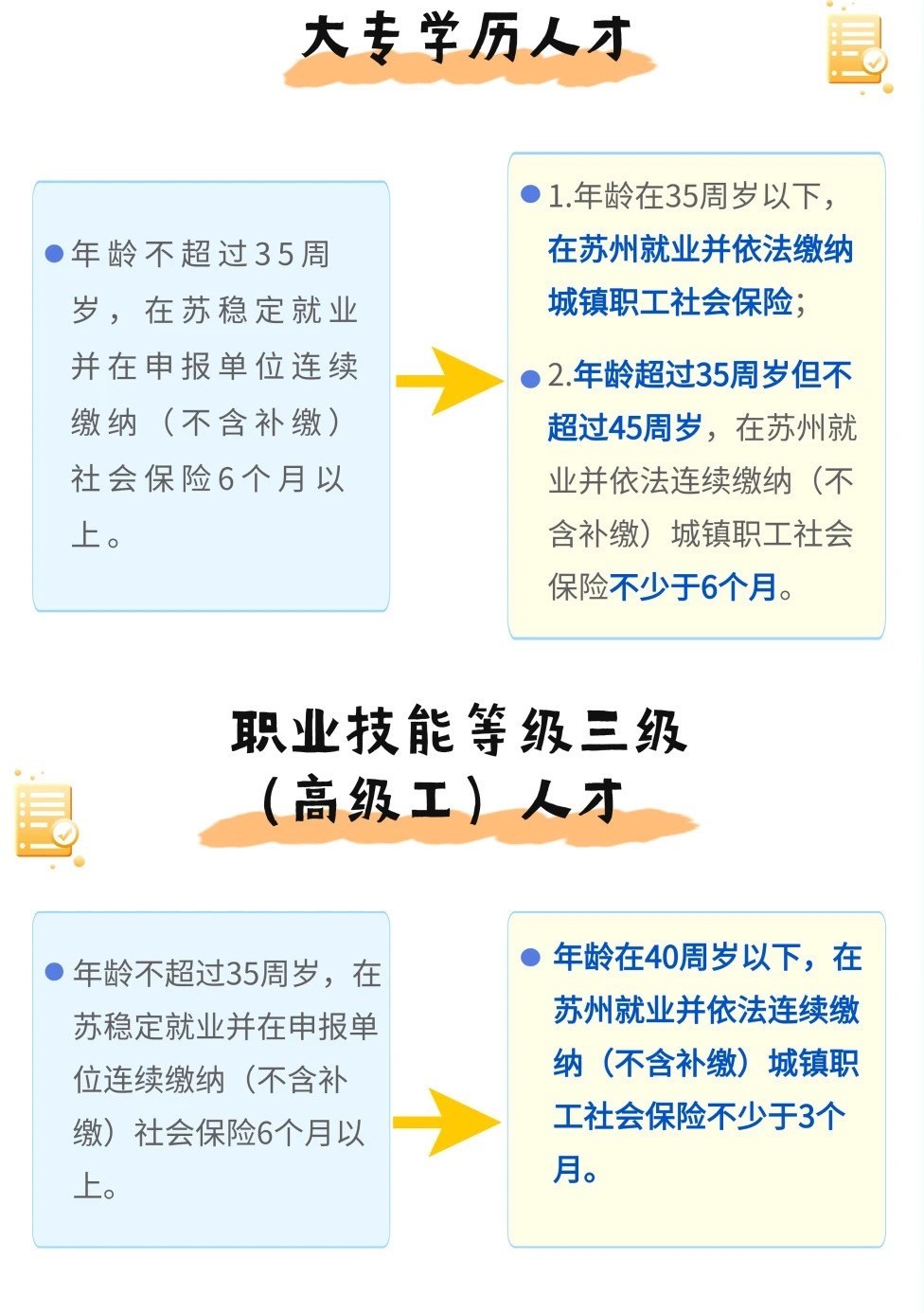 2.符合蘇州市引進(jìn)技能人才緊缺(工種)目錄的職業(yè)技能等級(jí)三級(jí)(高級(jí)工)社保繳費(fèi)年限、年齡放寬:年齡條件從35周歲放寬至40周歲,連續(xù)繳納社保時(shí)間從6個(gè)月縮減為3個(gè)月。