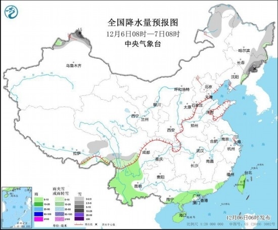 12月6日08時至7日08時,內(nèi)蒙古東北部、黑龍江西北部和東部、吉林東部、遼寧東部、新疆北疆北部和北疆東部、西藏東部、川西高原南部、云南西北部等地部分地區(qū)有小到中雪或雨夾雪,其中,吉林東部、新疆北疆北部等地局地有大到暴雪(10~15毫米)。四川南部、云南大部、廣西東南部、廣東南部、海南島、臺灣島等地部分地區(qū)有小雨,其中,臺灣島東部局地有中雨。內(nèi)蒙古東北部、遼東半島、新疆北疆北部、華北北部、浙江東部等地部分地區(qū)有4~6級風。