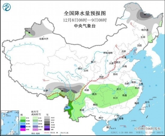 12月7日08時至8日08時,內(nèi)蒙古東部、黑龍江中西部、新疆北部、西藏東部、川西高原南部、云南西北部等地部分地區(qū)有小到中雪或雨夾雪,其中,新疆伊犁河谷、西藏東南部等地局地有大到暴雪(10~12毫米)。西藏南部、四川南部、云南中西部、臺灣島等地部分地區(qū)有小到中雨,其中,云南西部局地有大雨(25~45毫米)。內(nèi)蒙古中部、新疆北疆等地部分地區(qū)有4~6級風。