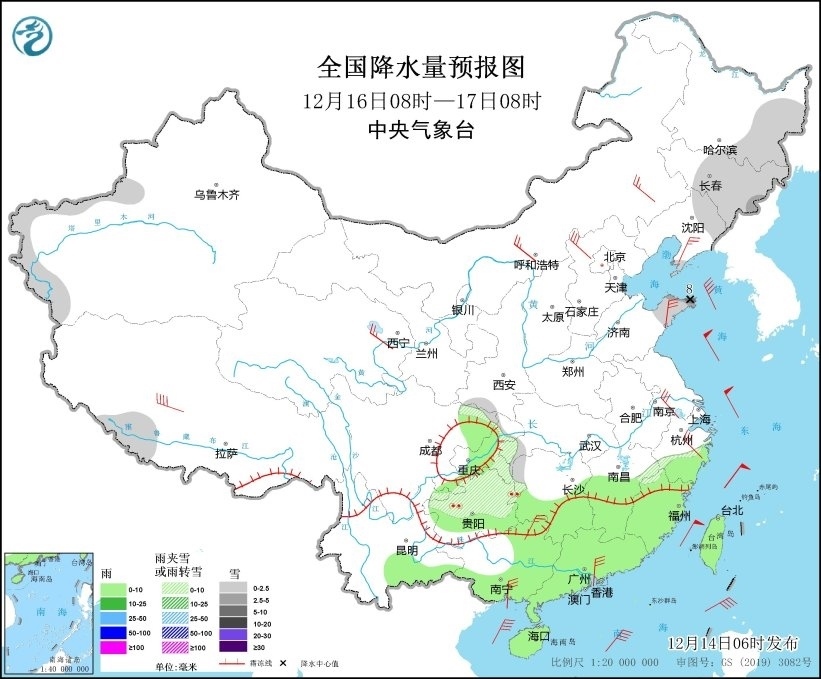 圖7 全國降水量預(yù)報圖(12月16日08時-17日08時)