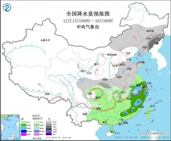 12月14日08時(shí)至15日08時(shí),西北地區(qū)中東部、內(nèi)蒙古中西部和東南部、吉林、遼寧、華北、黃淮大部、江淮西部、湖北北部等地部分地區(qū)有小到中雪或雨夾雪,其中,內(nèi)蒙古中部、吉林東南部、遼寧東部、陜西東南部、湖北西北部、河南大部、安徽北部、山東中西部、河北南部等地部分地區(qū)有大到暴雪,陜西秦嶺東部、湖北西北部、河南西部山區(qū)等地局地有大暴雪或特大暴雪(30~35毫米)。江淮東部、江漢大部、江南北部和西部、重慶等地部分地區(qū)有中到大雨。內(nèi)蒙古西部、甘肅河西等地部分地區(qū)有4~6級(jí)風(fēng)。