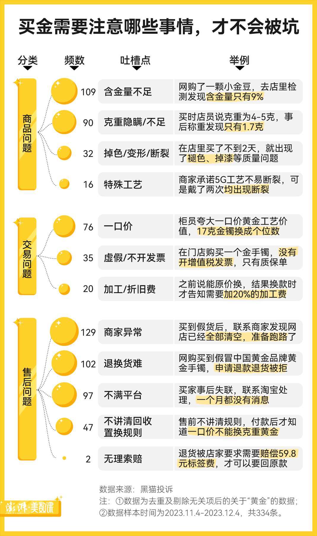 為了梳理出購買黃金中可能遇到的問題,澎湃新聞收集了2023年近一年來在黑貓投訴上的6000余條關于“黃金”的投訴數(shù)據(jù),發(fā)現(xiàn)含金量不足、克重不足等等,都是大家買金時較常遇到的商品問題。