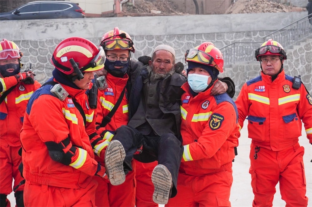 12月19日,在甘肅省臨夏回族自治州積石山保安族東鄉(xiāng)族撒拉族自治縣大河家鎮(zhèn)大河村,消防人員開(kāi)展救援。新華社記者 馬希平 攝