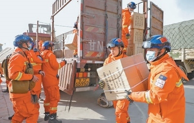 12月19日,在積石山縣大河家鎮(zhèn)大河村安置點(diǎn),消防人員搬運(yùn)物資。新華社記者方 欣攝