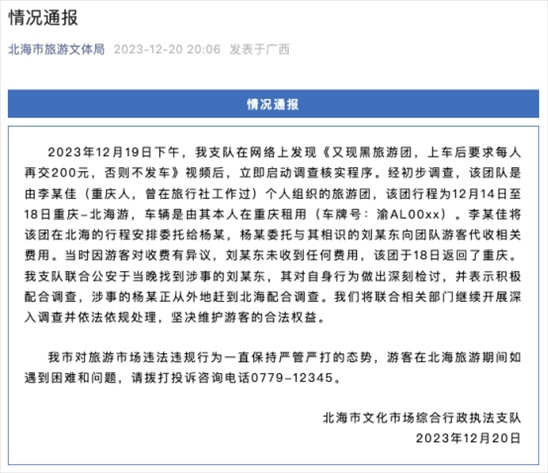 ·官方通報(bào)“廣西一旅行團(tuán)要求游客上車(chē)后每人再交200元”。