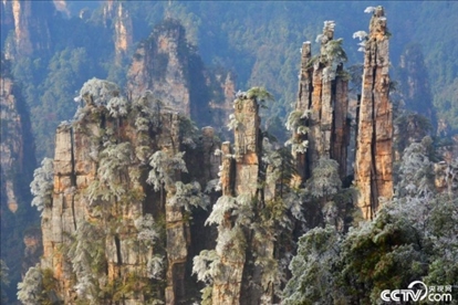 2023年12月19日,湖南省張家界市,張家界國(guó)家森林公園雪后放晴,天子山景區(qū)同現(xiàn)云海日出雪松冰掛等多種美景,美若仙境。