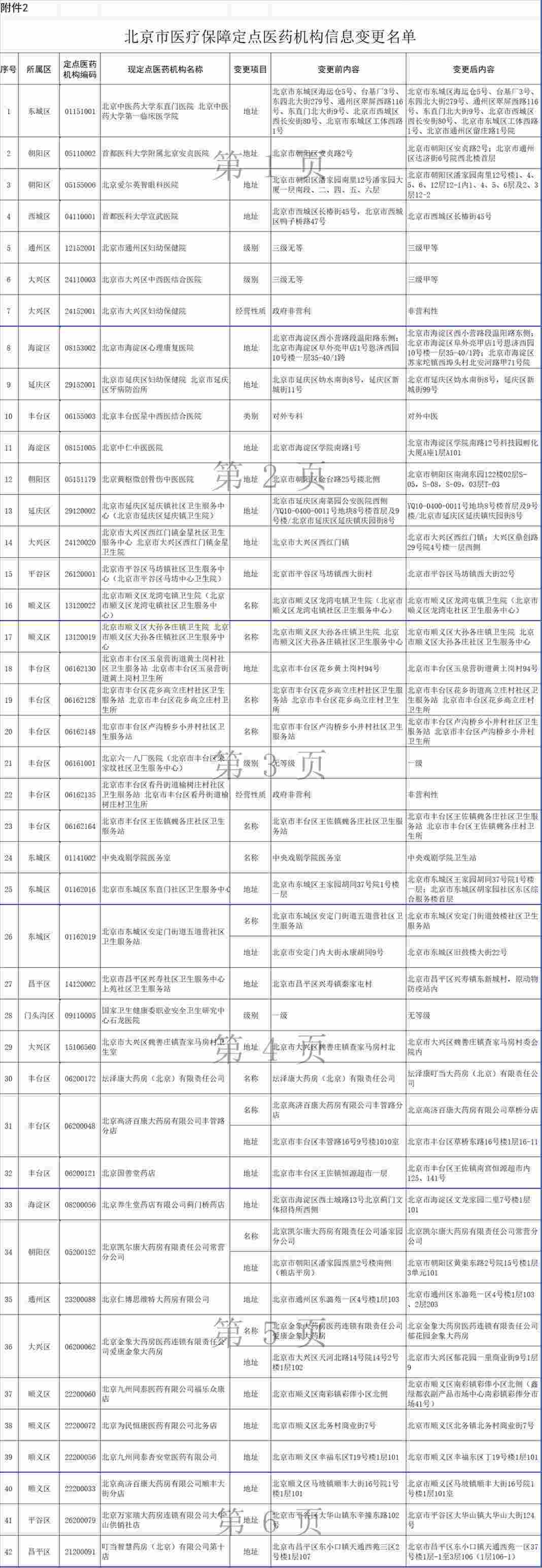 北京中醫(yī)藥大學(xué)東直門醫(yī)院等42家定點(diǎn)醫(yī)藥機(jī)構(gòu)申請(qǐng)信息變更,經(jīng)市、區(qū)醫(yī)保經(jīng)辦機(jī)構(gòu)審核,現(xiàn)決定對(duì)上述42家定點(diǎn)醫(yī)藥機(jī)構(gòu)的有關(guān)信息予以變更(見附件2)。