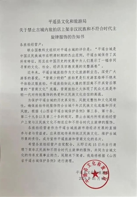·平遙古城禁止旅拍店上架非漢民族服飾?當(dāng)?shù)匚穆镁只貞?yīng):目前已刪除該告知書。