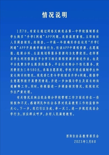 ·重慶一中學(xué)通知學(xué)生使用收費App交作業(yè)?教委回應(yīng):非強(qiáng)制,正退費。