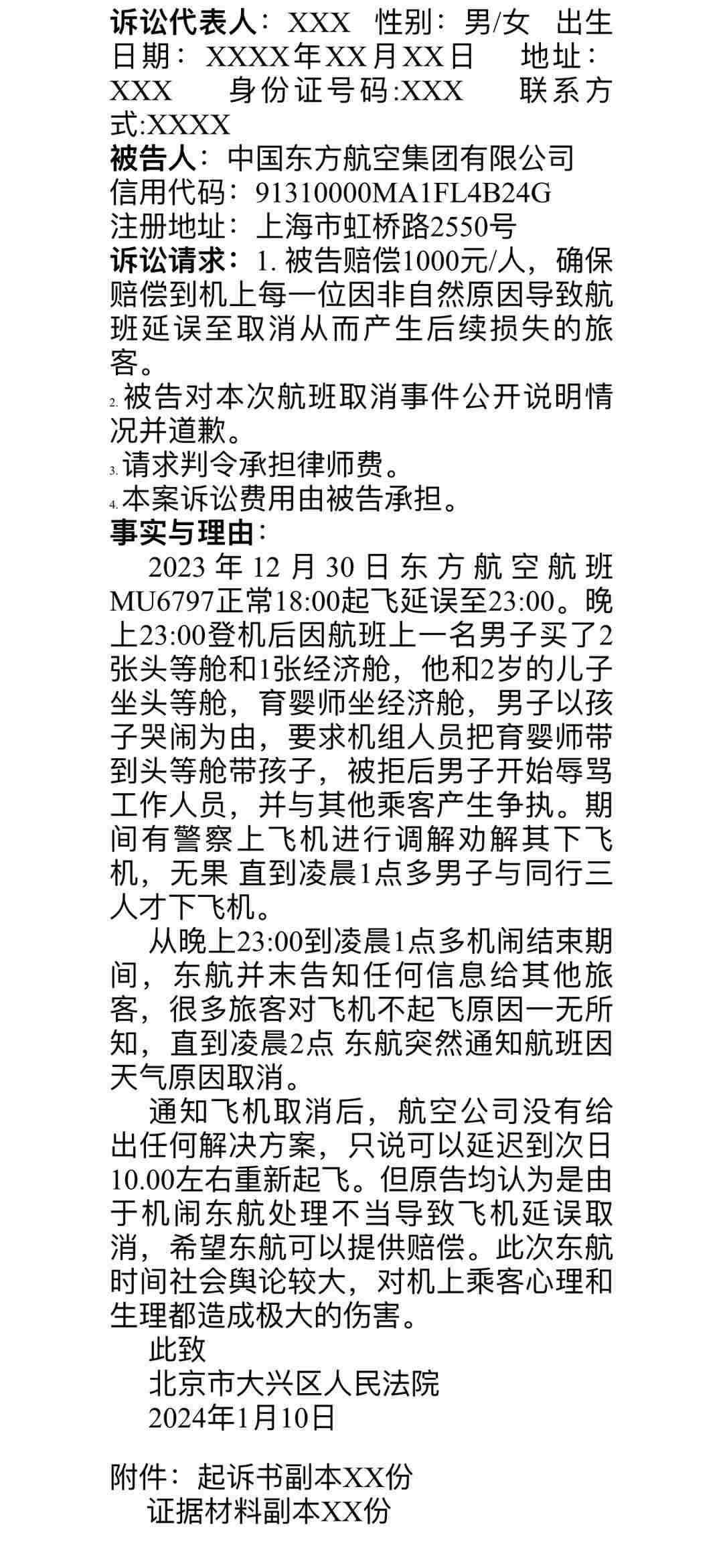 群內(nèi)發(fā)出的起訴書寫道:“從當日23點到次日凌晨1點多機鬧結束期間,東航并未告知任何信息給其他旅客,很多旅客對飛機不起飛原因一無所知,直到凌晨2點,東航突然通知航班因天氣原因取消。通知飛機取消后,航空公司沒有給出任何解決方案,只說可以延遲到次日10點左右重新起飛。但原告均認為是由于機鬧,東航處理不當,導致飛機延誤取消,希望東航可以提供賠償。此次東航事件社會輿論較大,對機上乘客心理和生理都造成極大的傷害?!睋?jù)悉,乘客們擬起訴至北京市大興區(qū)人民法院。