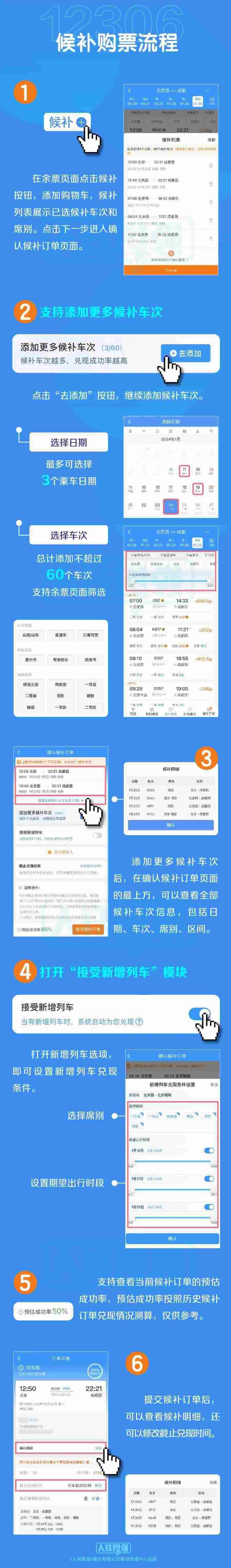 為提升旅客購(gòu)票體驗(yàn),鐵路部門(mén)加大研發(fā)力度,對(duì)鐵路12306候補(bǔ)購(gòu)票功能進(jìn)行了優(yōu)化升級(jí)。一是增加候補(bǔ)訂單數(shù)量。每名旅客可提交的待兌現(xiàn)候補(bǔ)訂單數(shù)量由2個(gè)增至6個(gè),每個(gè)訂單最多可添加9名乘車人。二是增加備選方案數(shù)量。原來(lái)旅客提交候補(bǔ)訂單時(shí),可選擇相鄰2個(gè)乘車日期、每個(gè)日期可選擇5個(gè)“車次+席別”的組合,最多可選擇10個(gè)組合。優(yōu)化升級(jí)后,旅客可選擇預(yù)售期內(nèi)任意3個(gè)乘車日期,累計(jì)最多可選擇60個(gè)“日期+車次”的組合,每個(gè)車次可選多個(gè)席別。三是擴(kuò)大候補(bǔ)訂單兌現(xiàn)時(shí)間選擇范圍。原來(lái)候補(bǔ)訂單截止兌現(xiàn)時(shí)間最晚為開(kāi)車前2小時(shí),優(yōu)化升級(jí)后調(diào)整為開(kāi)車前20分鐘,旅客可在更大范圍內(nèi)根據(jù)實(shí)際情況自主選擇修改截止兌現(xiàn)時(shí)間。四是臨時(shí)新增旅客列車席位優(yōu)先配售給已提交候補(bǔ)訂單的旅客。旅客在提交候補(bǔ)訂單時(shí),可選擇接受購(gòu)買(mǎi)符合出行需求的新增旅客列車車票,如鐵路部門(mén)臨時(shí)新增旅客列車,在車票起售時(shí),鐵路12306將自動(dòng)優(yōu)先配售給已提交候補(bǔ)訂單的旅客,旅客無(wú)需人工查詢?cè)鲩_(kāi)列車信息再購(gòu)票。