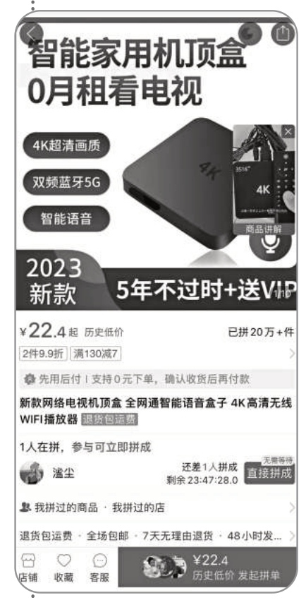 “0月租看電視”“這是一款可以讓你一輩子不用交有線電視費(fèi)的機(jī)頂盒”……在電商平臺(tái)上,一款網(wǎng)絡(luò)電視機(jī)頂盒各型號(hào)版本已售出超過(guò)20萬(wàn)件,在同類(lèi)商品中銷(xiāo)售量最高。記者購(gòu)買(mǎi)了一款售價(jià)47.88元的型號(hào),套裝內(nèi)包括機(jī)頂盒、配件以及永久會(huì)員。