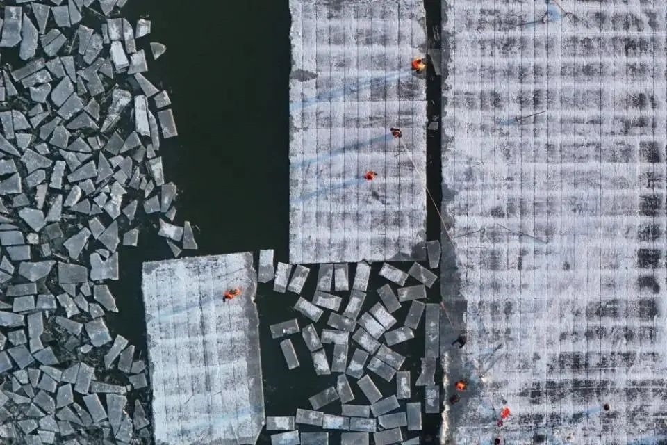 工人在松花江上的采冰現(xiàn)場進行采冰作業(yè)。圖源:新華社