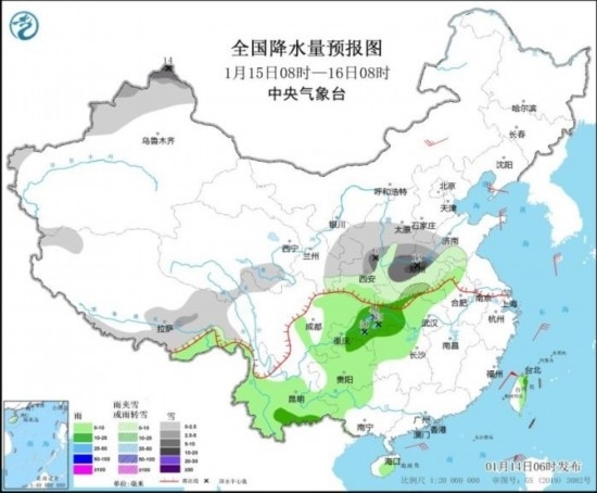 1月15日08時至16日08時,新疆西北部、西藏東部和南部、青海東南部、西北地區(qū)東部、華北南部、黃淮中西部等地部分地區(qū)有小到中雪或雨夾雪,其中,新疆西北部、陜西中部、山西南部、河南中北部等地部分地區(qū)有大雪或暴雪(10~14毫米)。安徽北部、湖北中西部、湖南西北部、貴州、云南大部、廣西西北部等地部分地區(qū)有小到中雨,其中,湖北西南部、重慶東部等地局地有大雨(25~40毫米)。內(nèi)蒙古中部、遼東半島、山東半島等地部分地區(qū)有4~5級風(fēng)。臺灣海峽、南海東北部海域?qū)⒂?~7級風(fēng)、陣風(fēng)8~9級。
