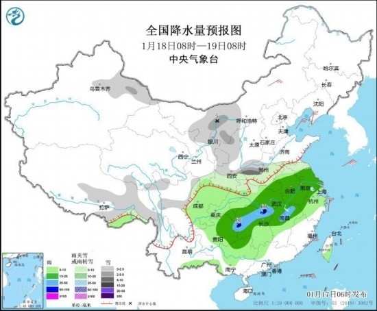 1月18日08時(shí)至19日08時(shí),內(nèi)蒙古西部、新疆北疆東部、西藏東部、西北地區(qū)東部、黃淮西部和南部、川西高原北部等地部分地區(qū)有小到中雪或雨夾雪,局地有大雪(5毫米)。江淮、江漢、江南北部和西部、西南地區(qū)東部、廣西等地部分地區(qū)有小到中雨,其中,湖南北部和西部、江西北部等地部分地區(qū)有暴雨(50~60毫米)。內(nèi)蒙古中部、遼東半島等地部分地區(qū)有4~6級風(fēng)(見圖2)。
