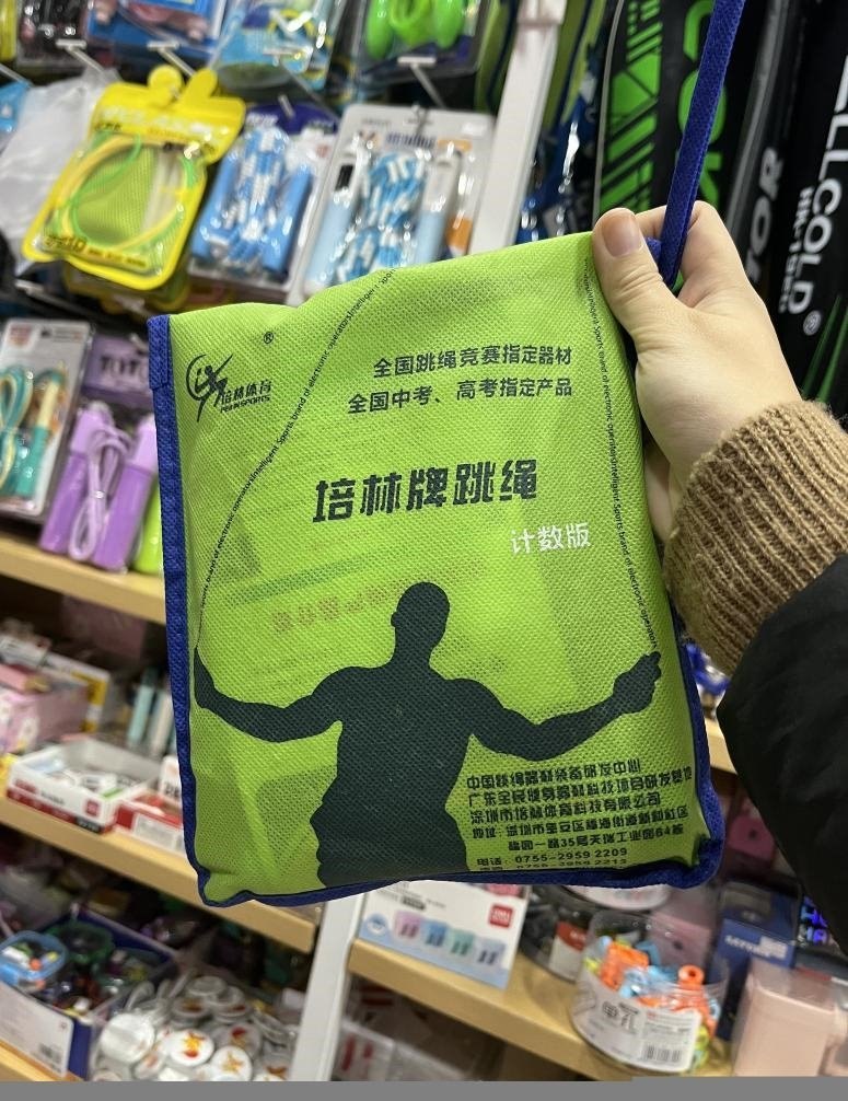在重慶,記者以家長身份走訪主城區(qū)多家中學周邊文具店,問及是否售賣“中考跳繩”時,多名店主不約而同向記者推薦同一品牌——培林牌跳繩。