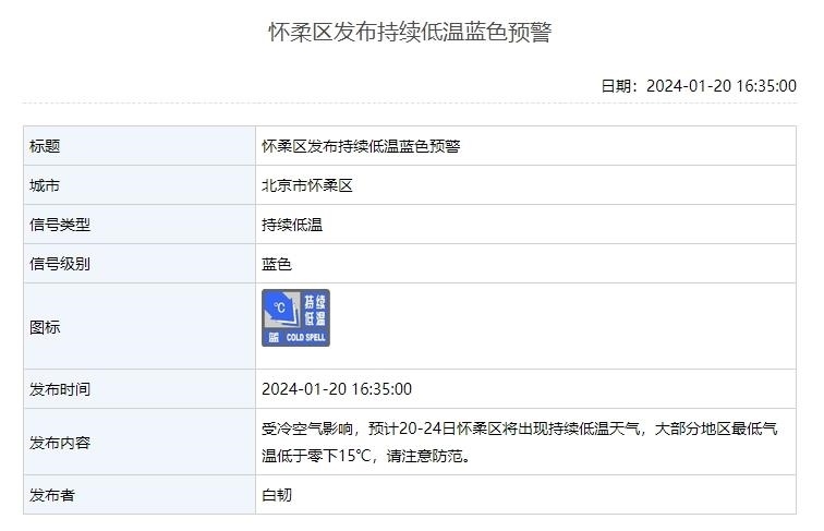 1月20日,北京延慶、懷柔、昌平3區(qū)發(fā)布持續(xù)低溫藍(lán)色預(yù)警。受冷空氣影響,預(yù)計20—24日這3個區(qū)將出現(xiàn)持續(xù)低溫天氣,其中延慶、懷柔兩地大部分地區(qū)氣溫低于零下15℃,請注意防范。