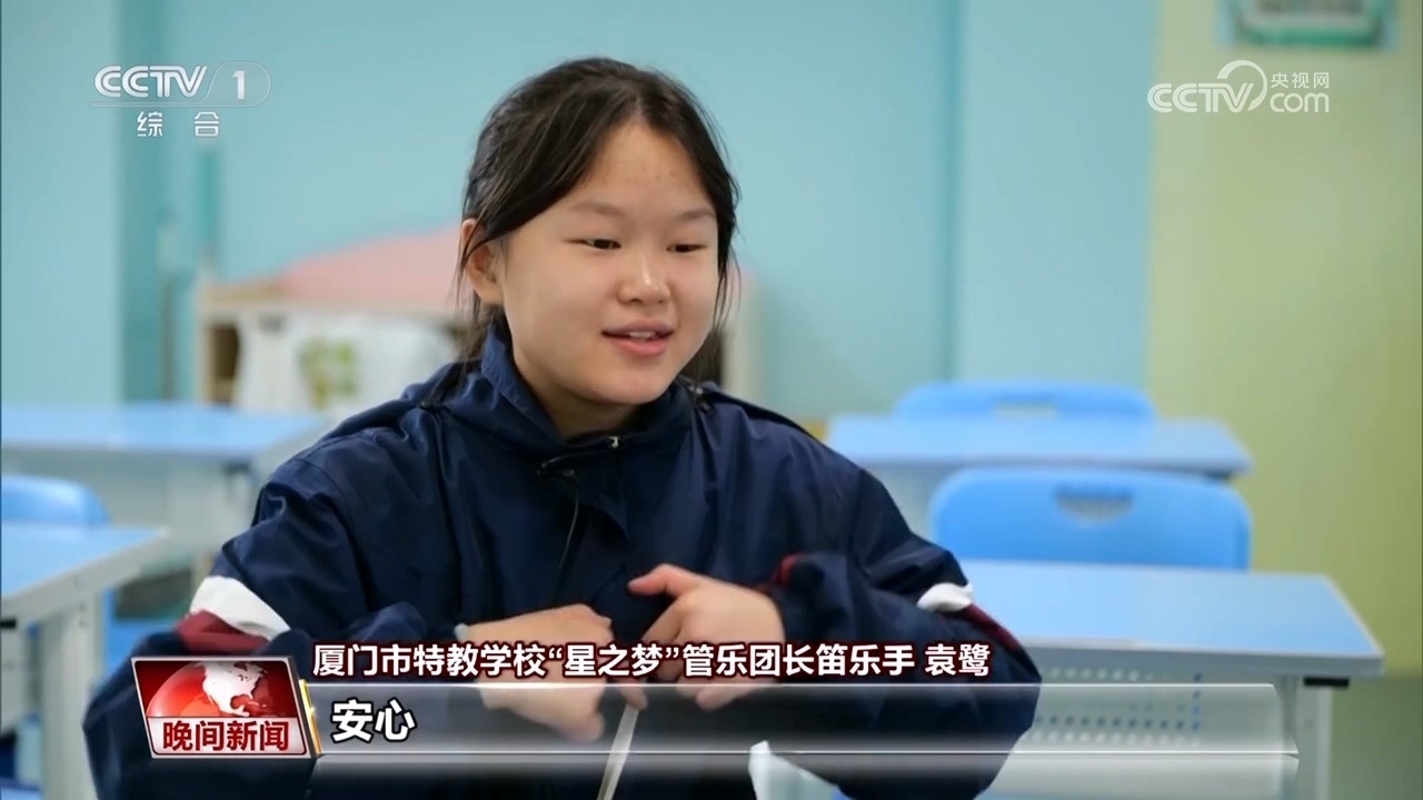 廈門市特教學(xué)?!靶侵畨?mèng)”管樂(lè)團(tuán)長(zhǎng)笛 袁鷺:我跟不上他們,然后老師肩膀拍我才可以跟得上。