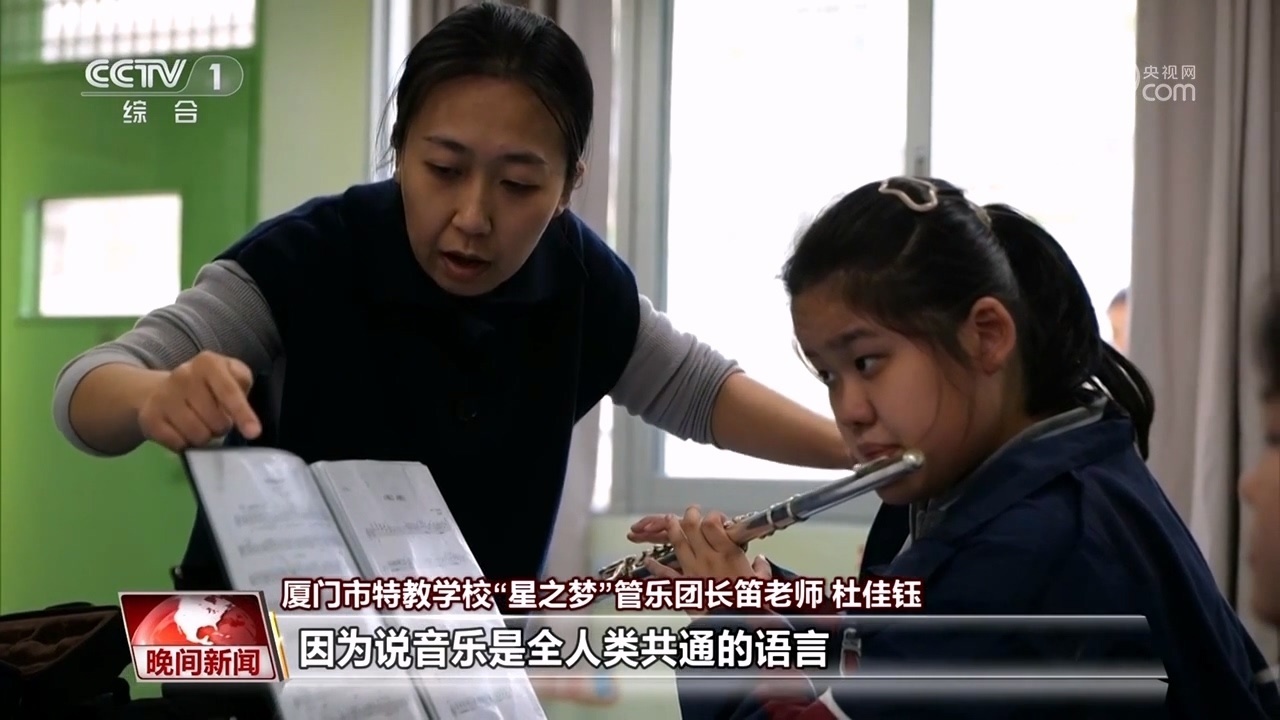 廈門市特教學(xué)?!靶侵畨?mèng)”管樂(lè)團(tuán)長(zhǎng)笛老師 杜佳鈺:因?yàn)檎f(shuō)音樂(lè)是全人類共通的語(yǔ)言,我希望這件事情的意義也是能不要把這些孩子排除在全人類的音樂(lè)的共同事業(yè)的范圍之外。