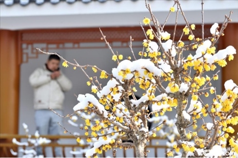2024年1月22日,一場(chǎng)大雪過(guò)后,湖北省襄陽(yáng)市??悼h蠟梅公園內(nèi)的蠟梅傲雪綻放,黃色的蠟梅和白色的積雪相映成趣,美不勝收。