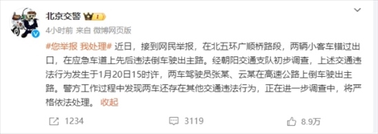 ·網(wǎng)民舉報(bào)“北五環(huán)廣順橋路段兩車(chē)在高速公路上倒車(chē)”,北京交警通報(bào)。