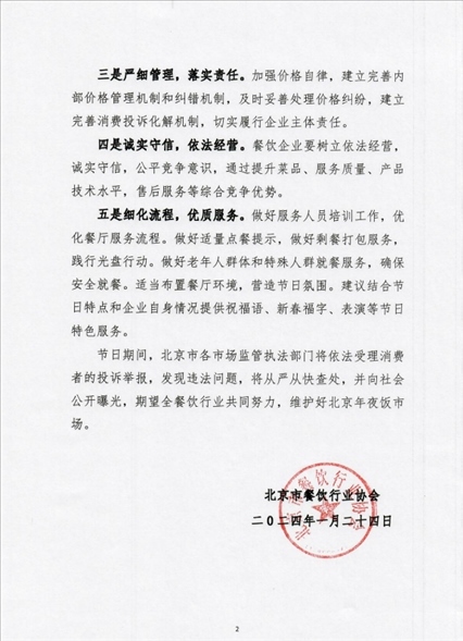 央視網(wǎng)消息:據(jù)北京市餐飲行業(yè)協(xié)會公眾號消息,據(jù)為進一步規(guī)范北京年夜飯市場秩序,營造首都良好節(jié)日餐飲消費環(huán)境,保障消費者合法權(quán)益,讓廣大市民體驗到優(yōu)質(zhì)的年夜飯服務。同時,更好地杜絕虛假價格、價質(zhì)不符、不合理定價、不合規(guī)收費等不規(guī)范行為,北京市餐飲行業(yè)協(xié)會特發(fā)布如下倡議: