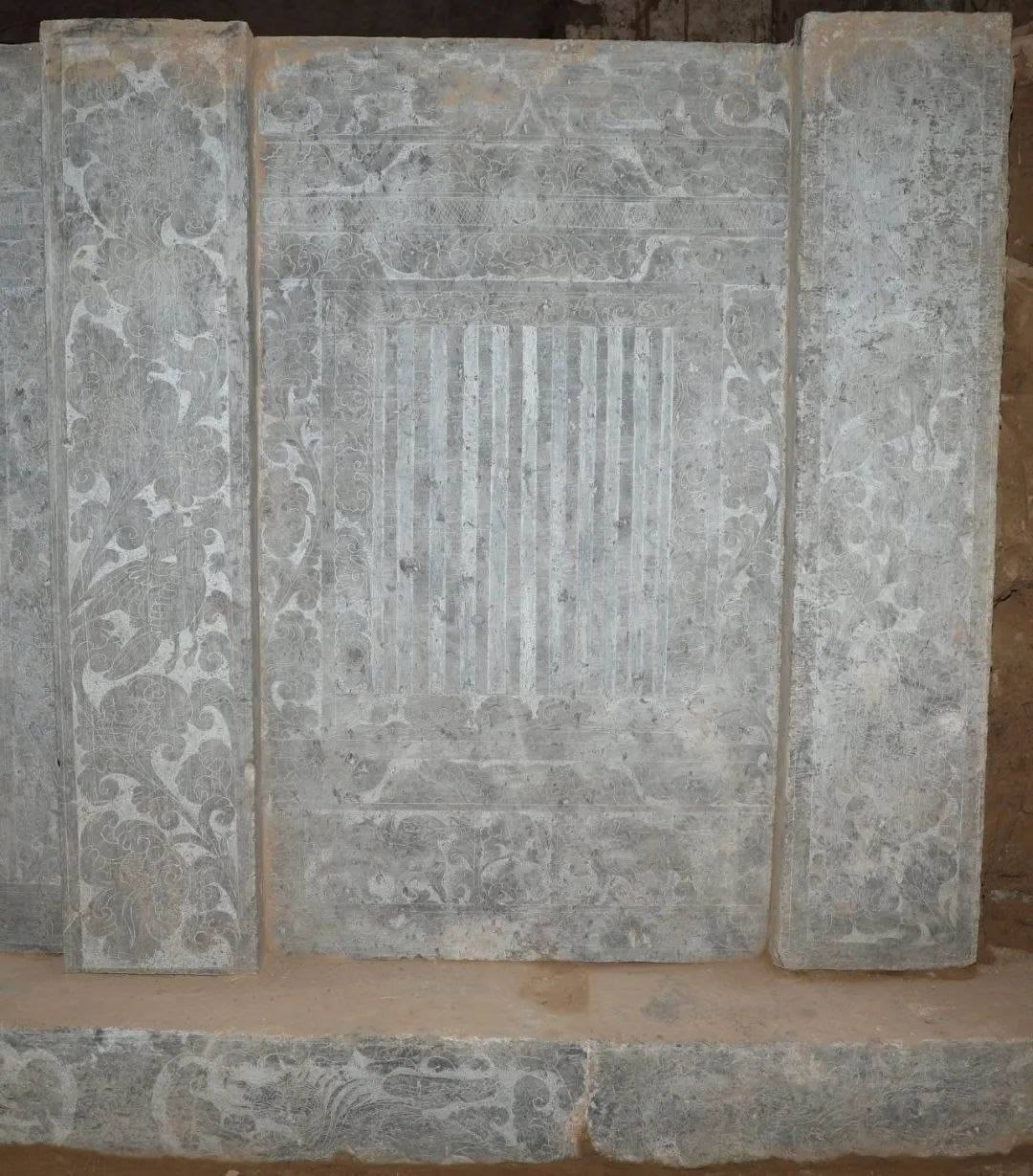 墓室西側(cè)發(fā)現(xiàn)石槨一具,保存較好。石槨面闊三間,進(jìn)深兩間,頂部為廡殿式,僅一側(cè)雕刻有瓦棱;槨身由壁板和倚柱卯和而成,板壁外側(cè)雕刻門(mén)窗、卷云及神獸,內(nèi)側(cè)主體為侍女,周邊飾有花草等內(nèi)容;倚柱內(nèi)外均刻纏枝卷草花朵,部分穿插飛禽走獸;基座以七塊石板鋪成,立面間隔刻有壸門(mén)圖案,內(nèi)填奔獸圖樣。石槨線刻精細(xì),畫(huà)面華麗而不繁縟,人物體態(tài)豐腴而不臃腫,充分體現(xiàn)出盛唐開(kāi)元時(shí)期圖案靈動(dòng)、富于想象的特征。
