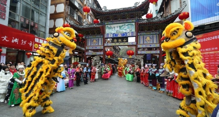 各地舉辦豐富多彩的民俗展演活動慶新春,人們在貴州省黔南布依族苗族自治州都勻市石板街觀看舞獅表演。
