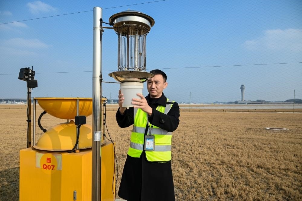 在成都天府國際機(jī)場(chǎng),飛行區(qū)管理中心生態(tài)圍界管理室主管劉泰杉在維護(hù)驅(qū)鳥設(shè)施。(受訪者供圖)