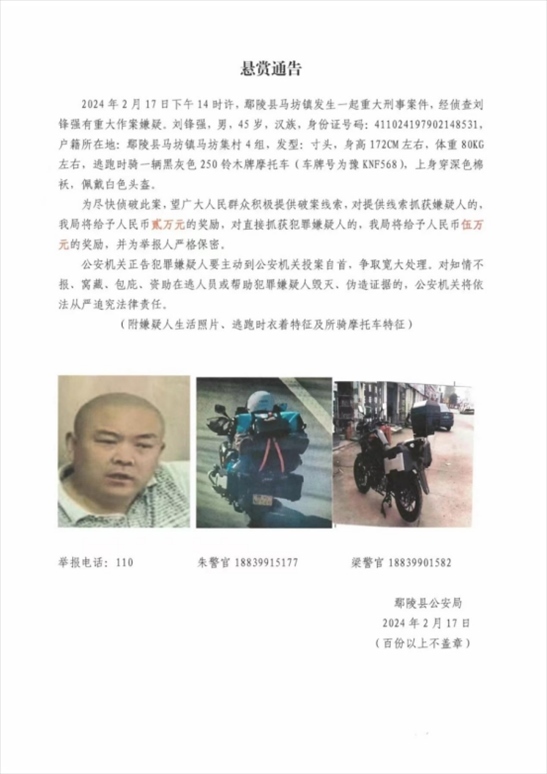 ·河南鄢陵縣發(fā)生重大刑案,警方懸賞5萬緝捕嫌犯。