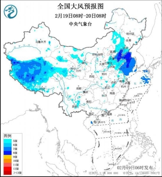 中央氣象臺2月19日6時繼續(xù)發(fā)布大風藍色預警:預計,2月19日8時至20日8時,西藏中西部、青海中南部、內(nèi)蒙古東南部、遼寧西部和南部、華北東部、黃淮東部、江淮東部等地的部分地區(qū)有5~6級風,陣風7~9級。渤海、渤海海峽、黃海大部海域將有7~8級風,陣風9~10級。
