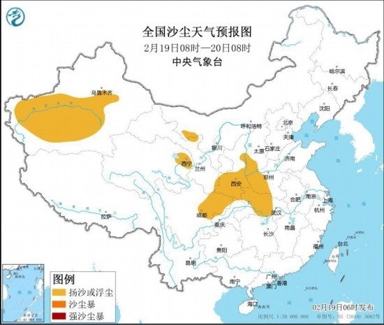 中央氣象臺2月19日6時繼續(xù)發(fā)布沙塵暴藍色預警:預計2月19日8時至20日8時,新疆南疆盆地、內(nèi)蒙古西部、青海東北部、陜西中南部、山西西南部、河南西部、湖北中西部、四川盆地中北部等地的部分地區(qū)有揚沙或浮塵天氣。
