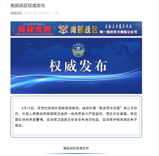 ·南部戰(zhàn)區(qū)回應(yīng)菲方組織所謂“聯(lián)合空中巡邏”:情況盡在掌握,戰(zhàn)區(qū)部隊保持高度警惕。