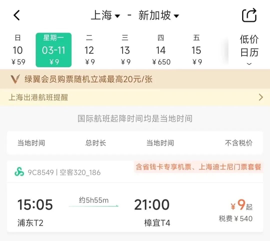 值得注意的是,這張截圖來自某訂票平臺,如果查看春秋航空官網或者APP,并沒有不含稅0元的票價,而是最低9元(不含稅)。