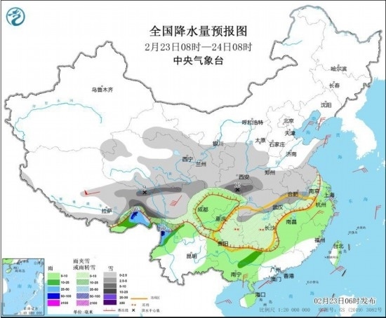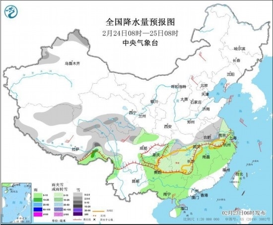 全國降水量預(yù)報圖(2月23日8時-24日8時)